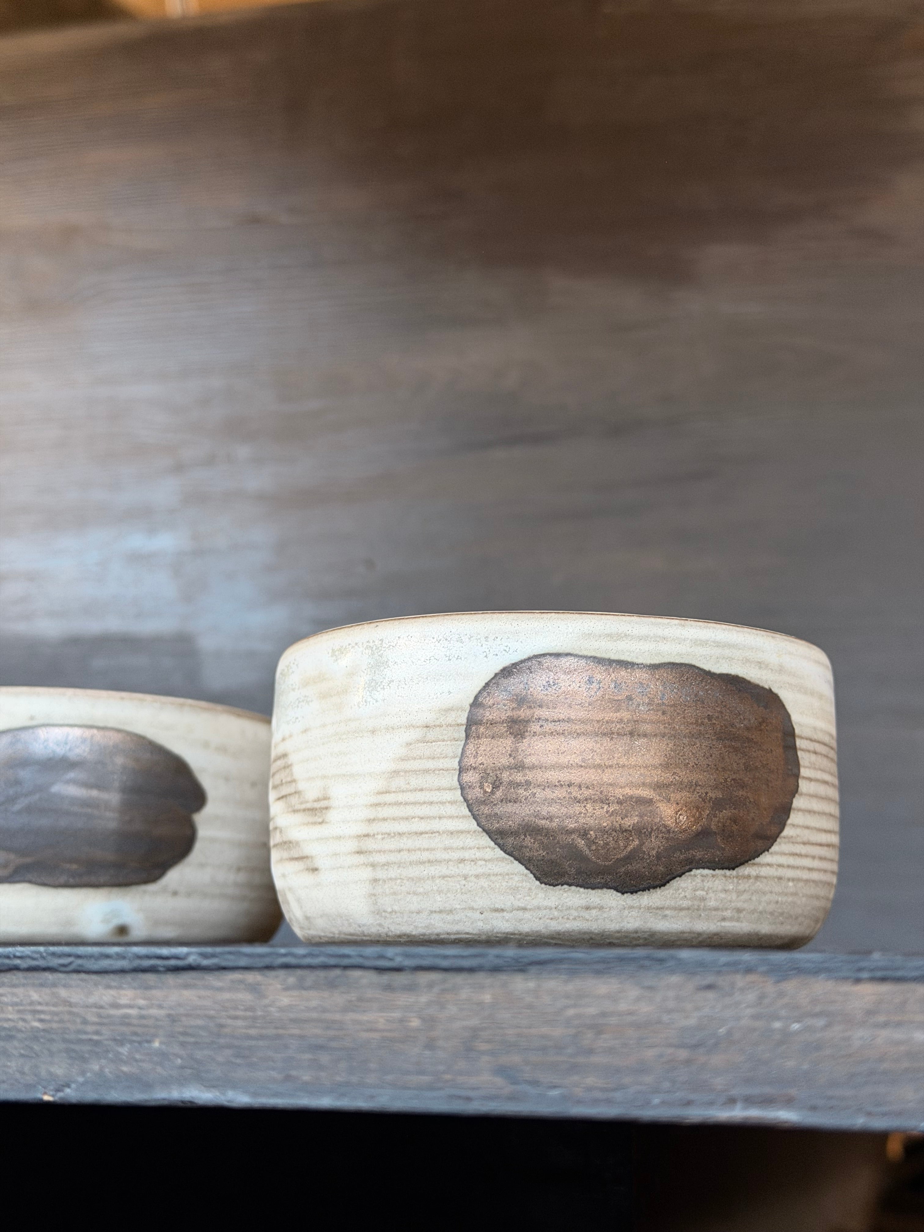 matte effektreiche Glasur in Creme Beige mit goldenem Akzent an der Vorderseite