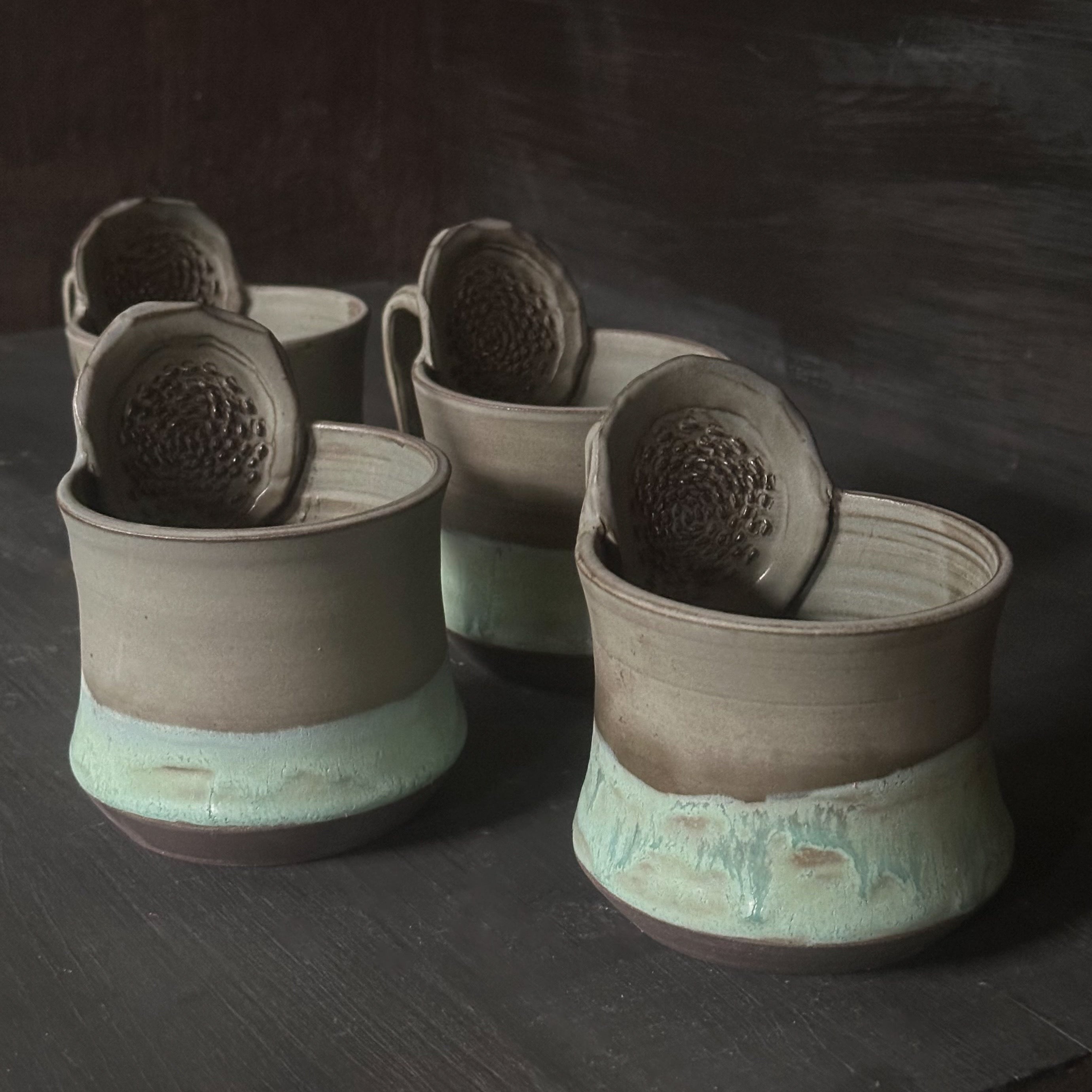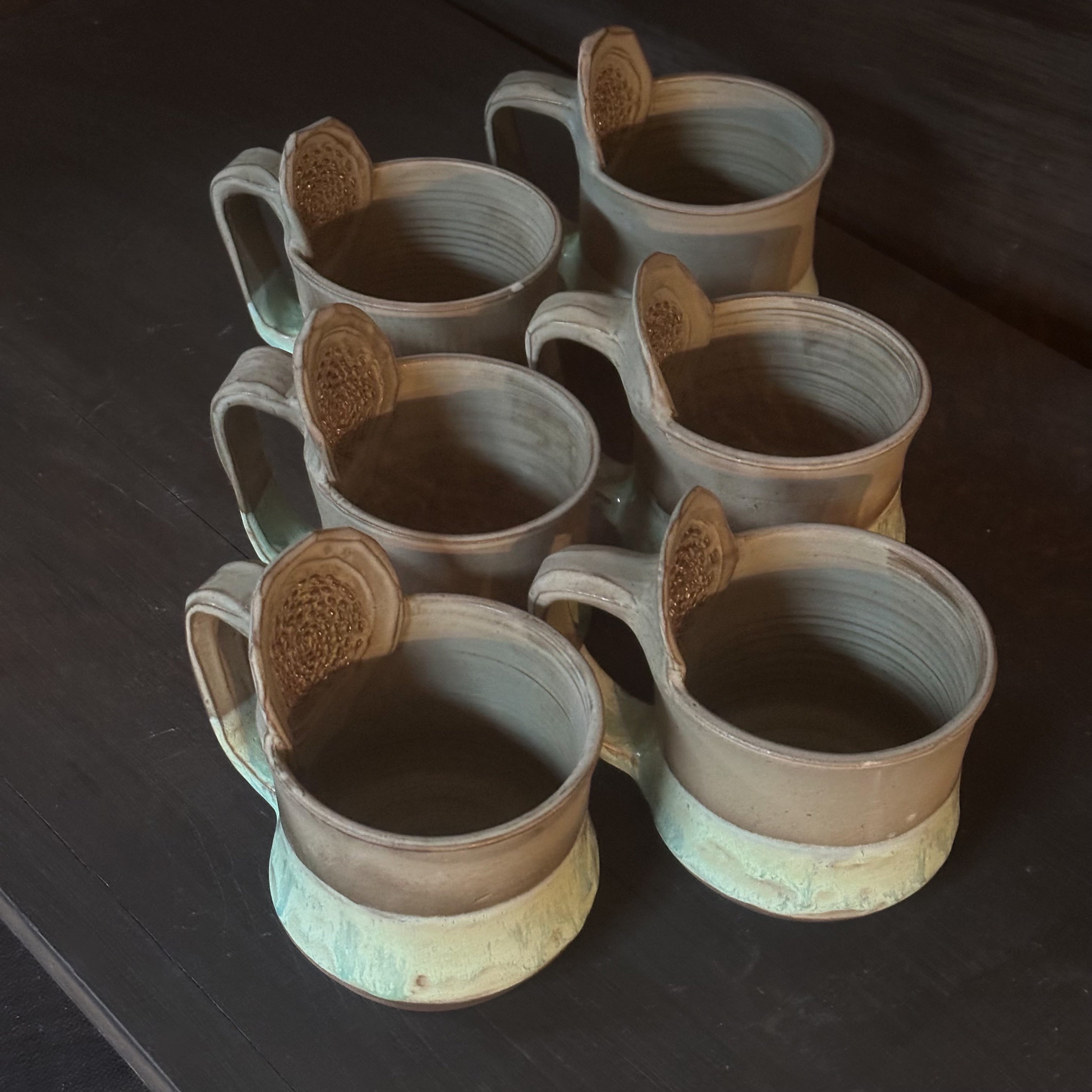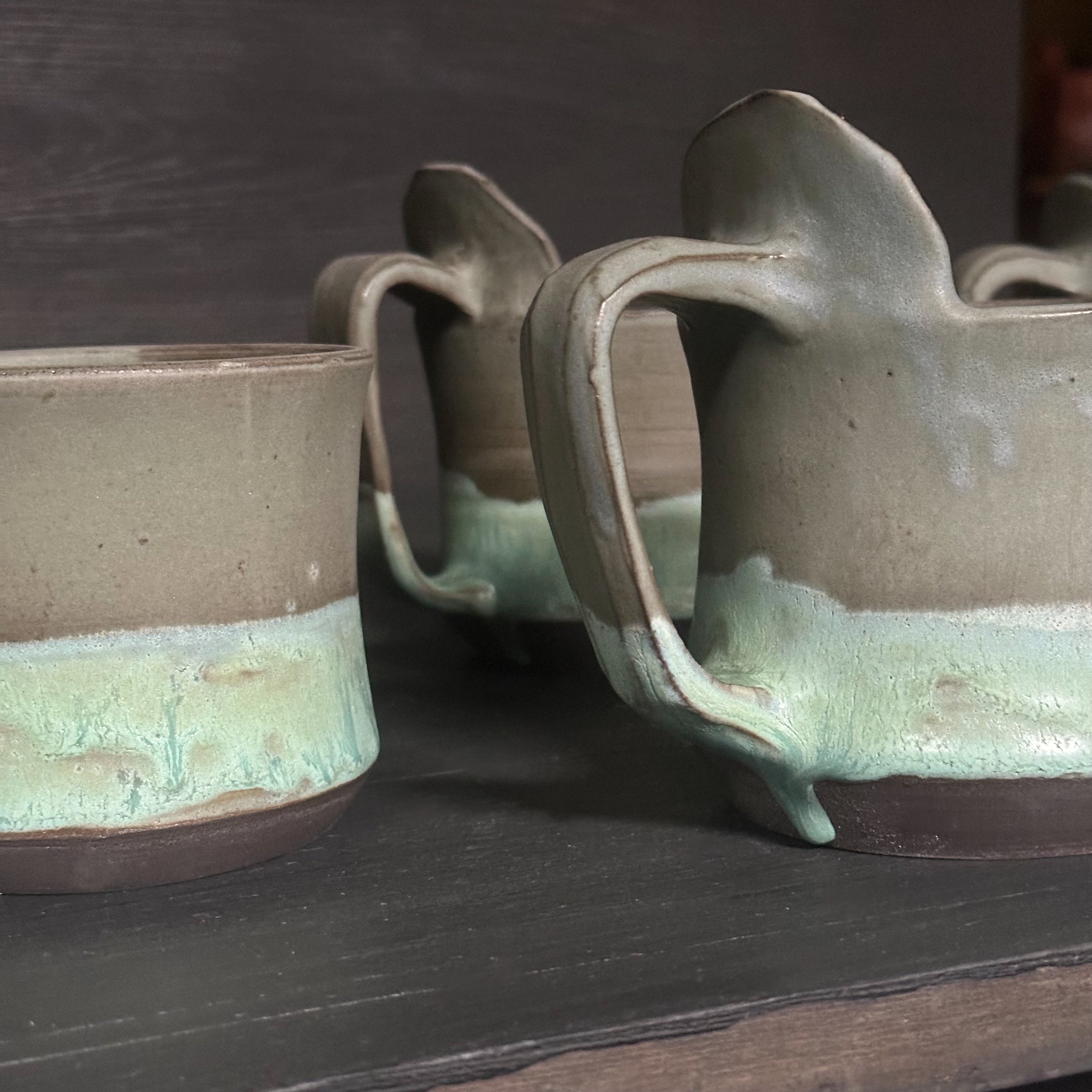 Wheelthrown & handbuiltDie Glasur “Glacier” ist eine unberechenbare Diva und sehr heikel beim Auftrag. Ein Ticken zu wenig und das Türkis kommt kaum durch, eine Spur zu viel davon und es bilden sich Tropfen (siehe Foto). Das allerdings kann eine interessante Facette sein. Wer allerdings gerade Glasurabschlüsse mag, tut besser daran, eine andere Glasur zu wählen. In jedem Fall ist jede einzelne Tasse einzig in ihrer Art.