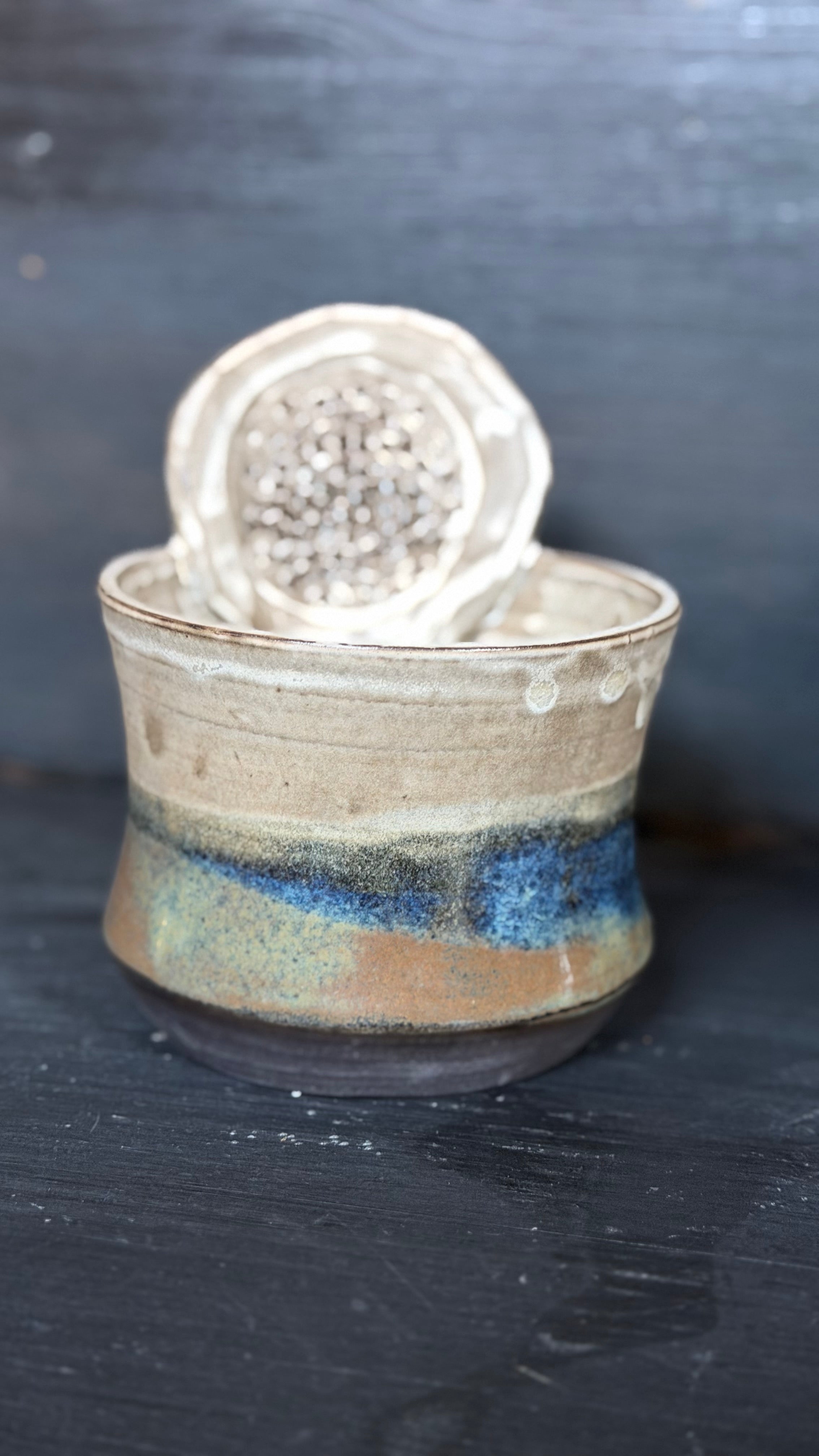 wheelthrown & handbuiltDieses Mal ist die Glasur besonders lebendig mit vielen Effekten sowohl in der matten Glasur oben als auch in der glänzenden Glasur unten.