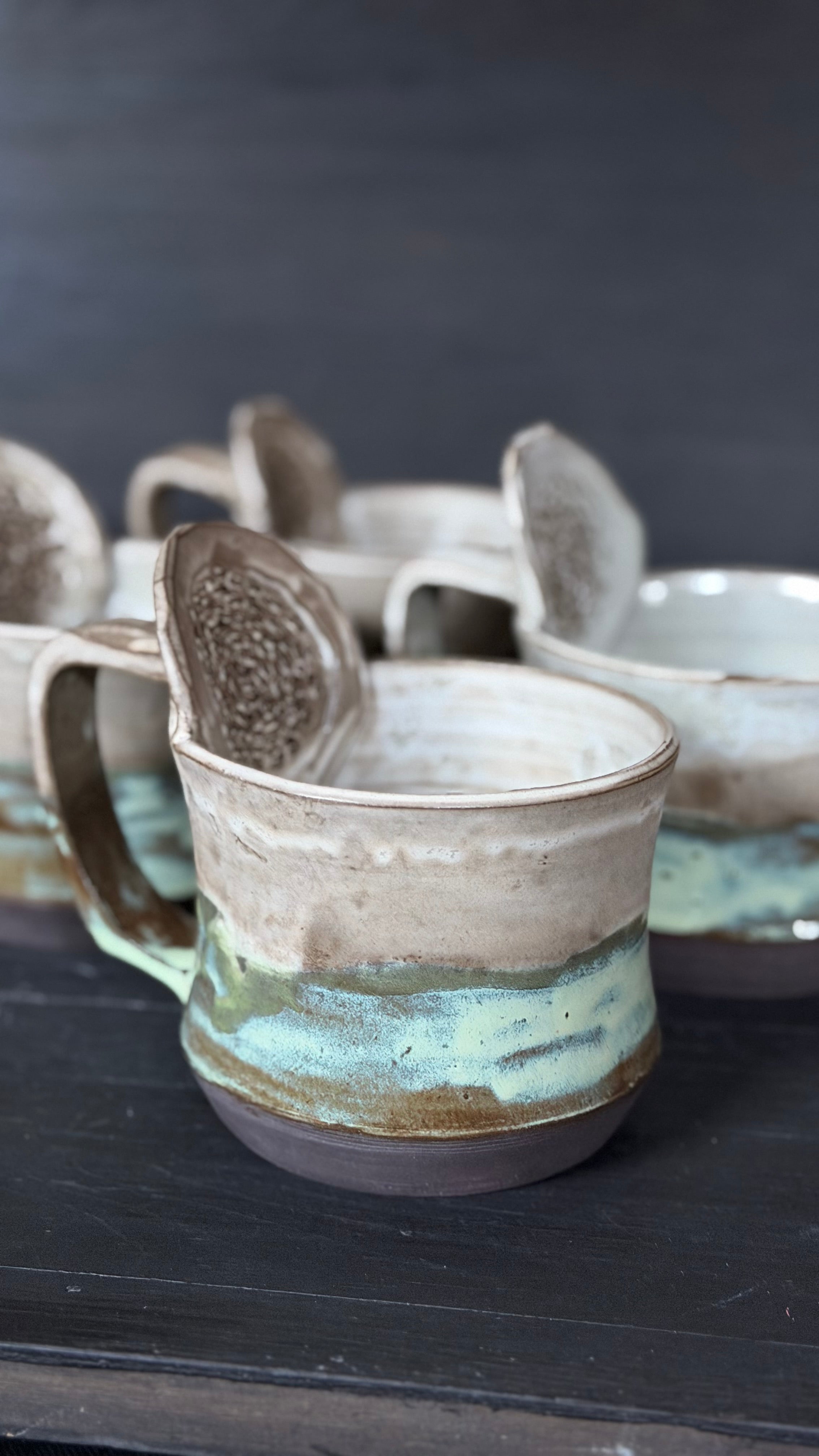 Ich habe es im Newsletter schon angekündigt. Diese Serie wurde besonders wild und “arty”. Diese neue Glasurkombination ist eine der Gründe dafür. Ich sehe darin ganz Küstenlandschaften und eine wilde See. Umso lnger man schaut, umso mehr erkenne ich. Ganze Geschichten verstecken sich darin, ober eben “nur” ein Ingwertee mit Honig. Ganz wie du magst.